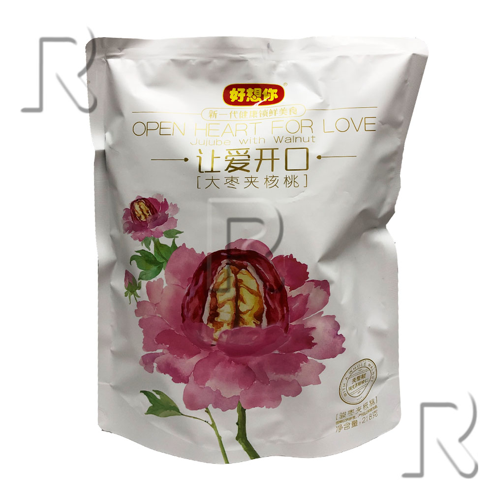 红枣夹核桃也可以叫枣夹核桃,枣夹核桃仁,红枣夹核桃仁。是将红枣(干枣)剖开夹入核桃仁的食品,是将剥好的核桃仁夹在红枣里,味道好,吃起来方便。红枣性温、甘,补脾益气,养血安神,而且可以缓解贫血、烦闷失眠、胃气不和等症状。而且红枣的营养成分在蒸或煮之后能更加充分有效地发挥效用,但同样红枣含有大量的维生素和碳水化合物,过多进食也不好。核桃可以补养气血、补肾固精、润燥化痰。 试试好想你的大枣夹核桃吧,营养又健康