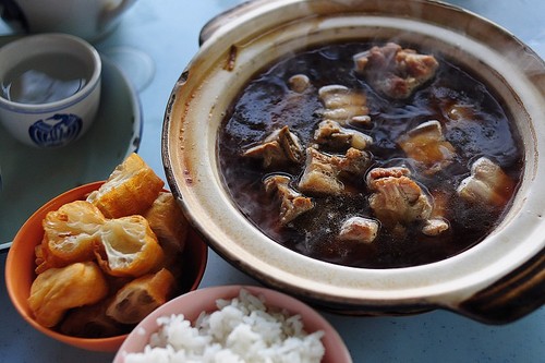 肉骨茶通常伴白饭或以油条蘸汤来吃。以酱油、碎红椒和蒜蓉一起调味。 各类中国清茶(马来西亚的巴生河流域地区以鐡观音最为流行)通常会随汤奉上,相信可以清走猪肉的油腻。在马来西亚,肉骨茶是一道典型的早点菜式。