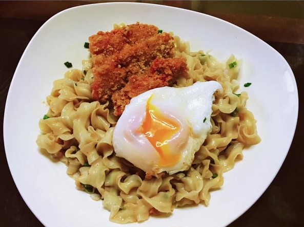 2. 在拌好的曾拌面上面加点小葱,一颗糖心蛋和少量鸡排。也可以依个人口味添加其他辅料。