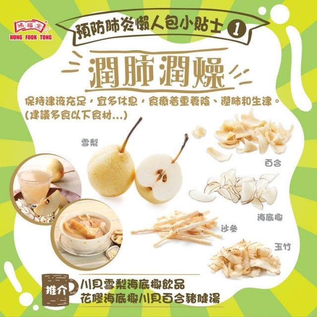 第一個保健貼士就係:潤肺潤燥~要保持津液充足,除咗多休息、多飲水之外,更可以配合養陰、潤肺同埋生津嘅食療,建議大家多食以下嘅食材: