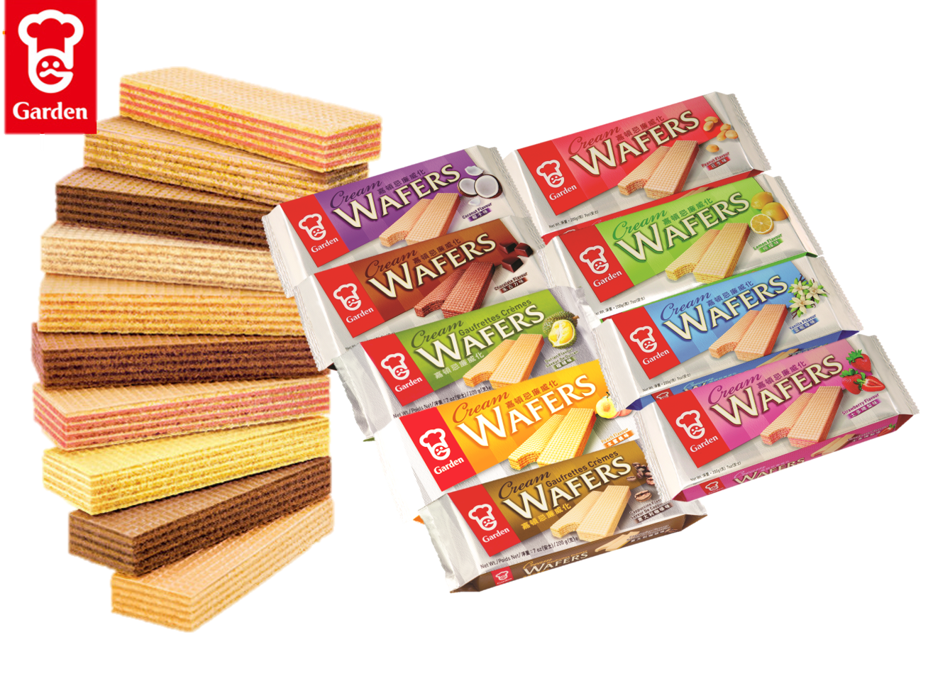 The famous Garden Chocolate Wafers are wafers coated with rich chocolate and crispy rice puff, layered with smooth milk cream fillings. You may enjoy the wafers anytime and share them with friends anywhere.